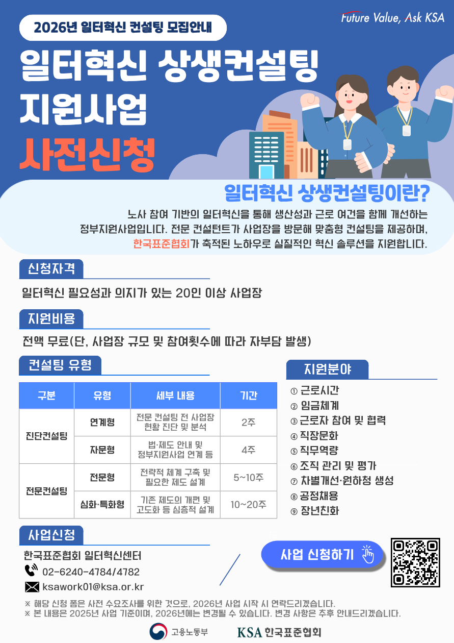 한국표준협회에서는 고용노동부 주관 「2026년 일터혁신 상생컨설팅 지원사업」에 참여할 사업장을 모집하오니,