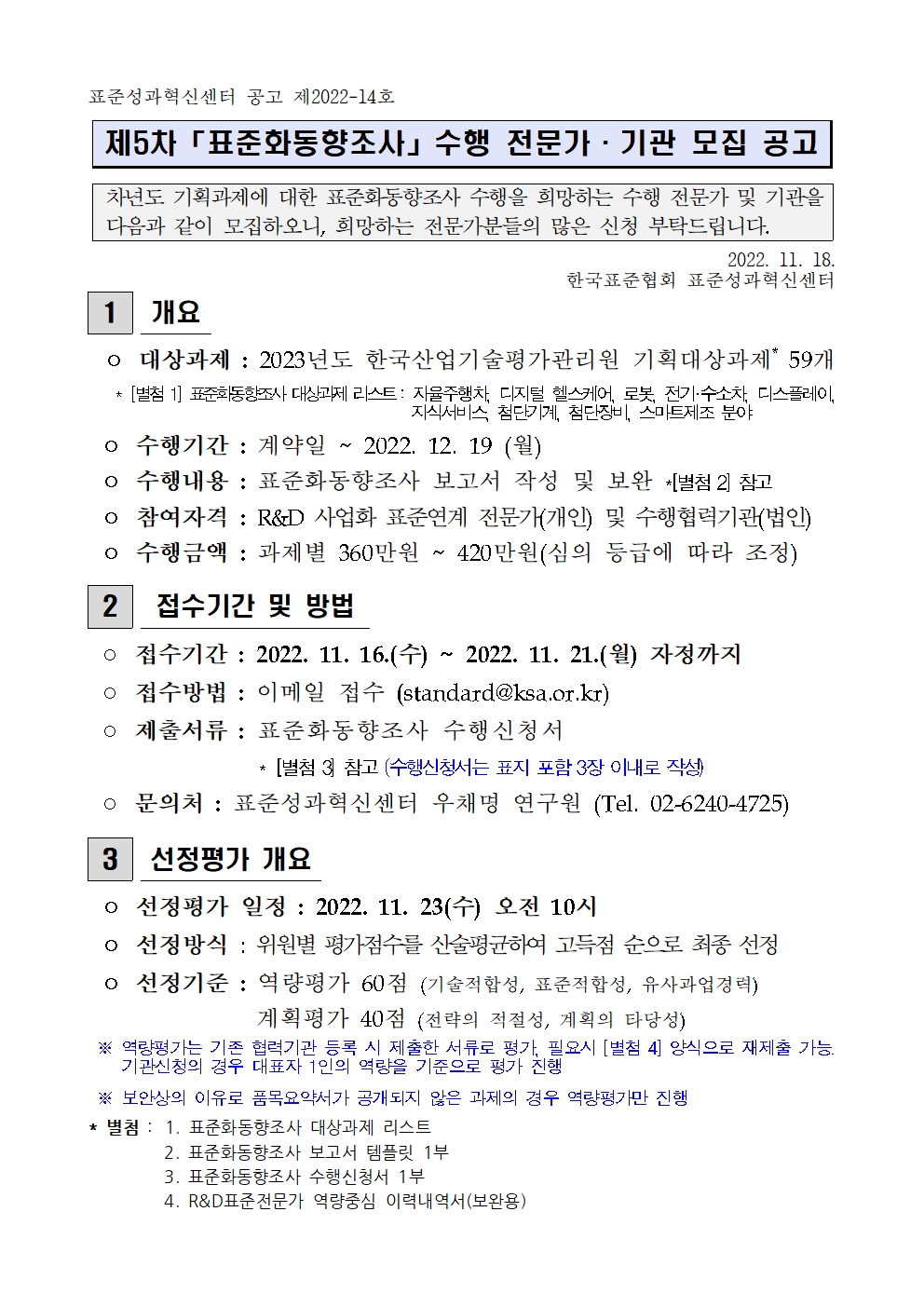 제5차 「표준화동향조사」 수행 전문가 모집 공고